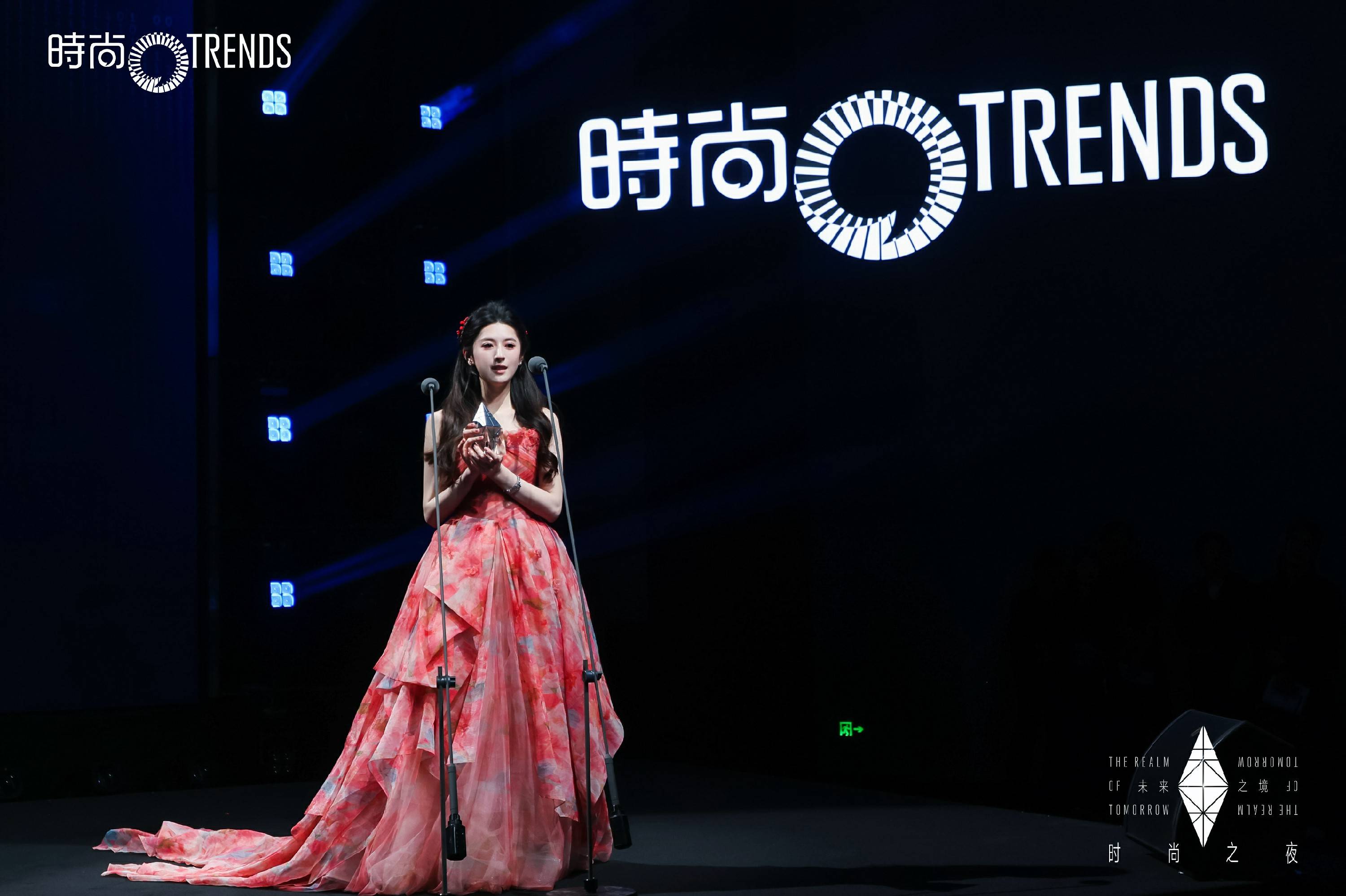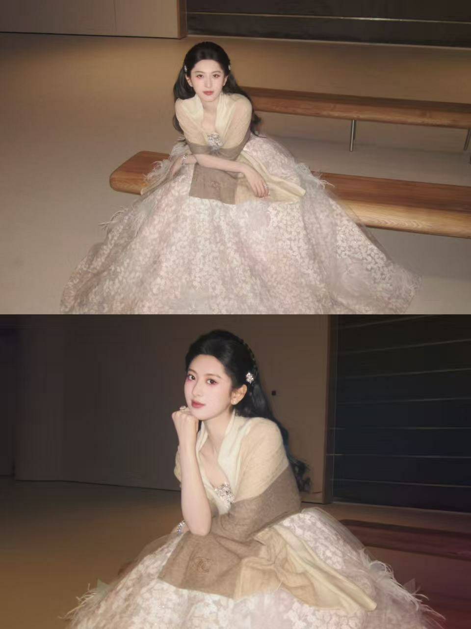 而真正的高光时刻,属于颁奖礼台。当苏棋的名字被郑重念出,聚光灯如命运般汇聚。水红色长裙恰似朝霞浸染的第一缕云霭,明媚而不失雅致。长长的裙裾在身后迤逦铺展,随着她轻盈的步态,拖尾如灵动的羽翼般飘逸摆动,仿佛林间精灵踏入凡尘的庆典,于华丽殿堂中注入一抹灵动的生机。从星河的清冷到花霞的暖艳,两套造型宛若她演员身份的一体两面:既可承载深邃的故事,亦能绽放灼热的生命力。