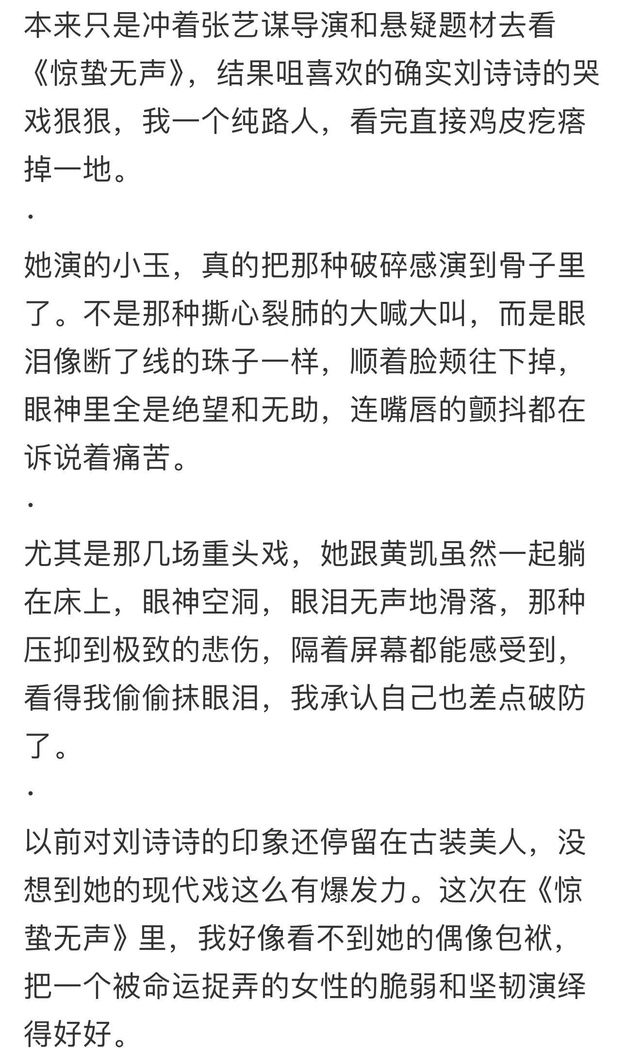 刘诗诗的哭戏一直广为称赞,在惊蛰无声中,她的无声哭戏再次打动观众。仅靠眼眶泛红、喉结滚动等生理细节展现破碎感,没有多余台词,没有激烈肢体动作,仅凭情绪的内敛传递,就把被最信任之人欺骗的绝望、身为母亲的隐忍演得真实可感。这种无声胜有声的表演,让小玉跳出了单薄的工具人设定,成为影片中最具温度与痛感的角色。