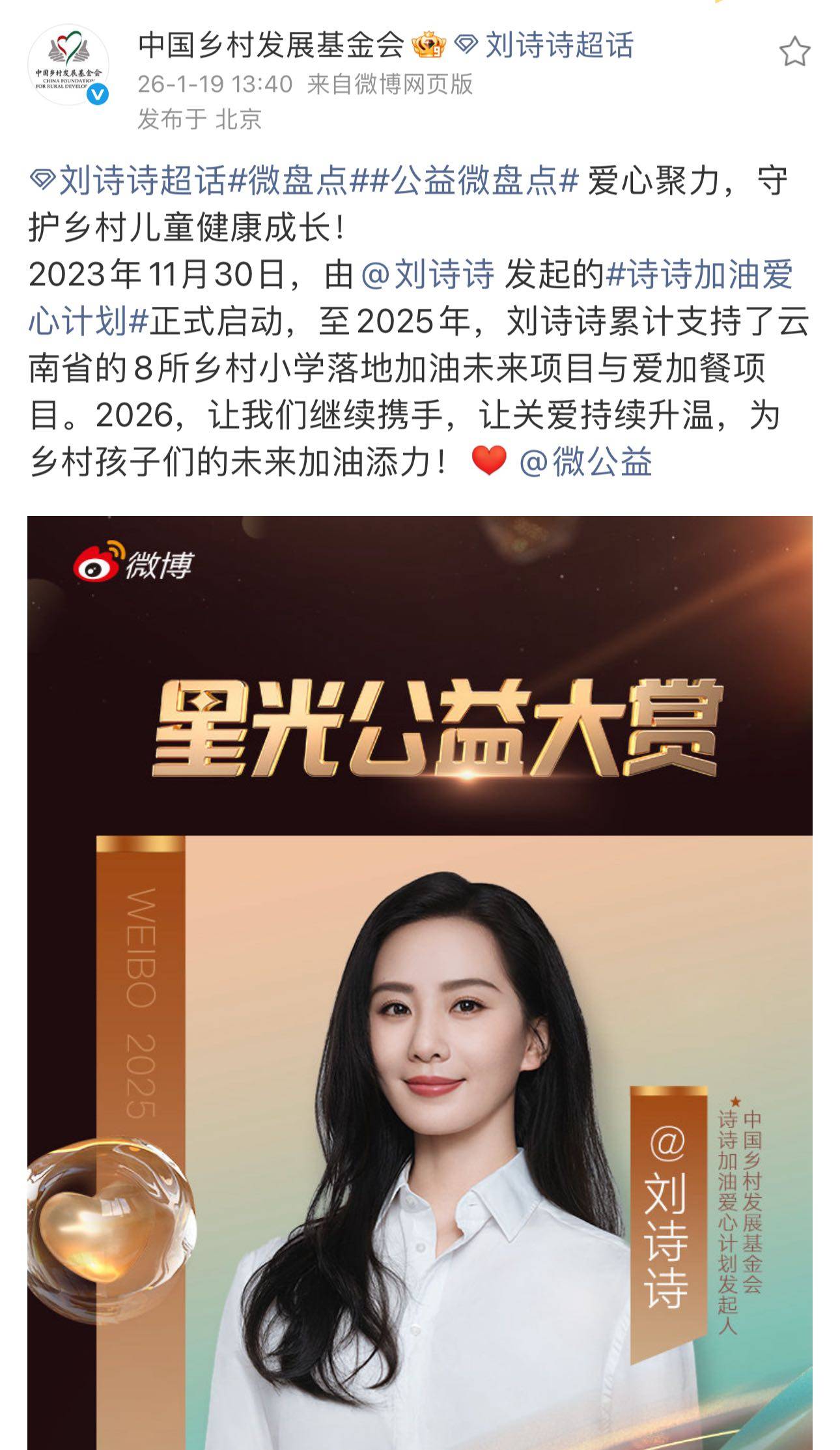 比起聚光灯下的耀眼,刘诗诗让人动容的是星光之下的温暖。在中国乡村发展基金会的公益盘点中,她两年内支持8所乡村学校落地项目的善举被悄然记录。这并非偶然的善举,而是她长期低调做公益的展现。从捐赠“母亲邮包”关爱贫困母亲,到关注女性宫颈健康,再到参加以公益为核心的综艺《一路前行》,她的行动始终走在话语之前。